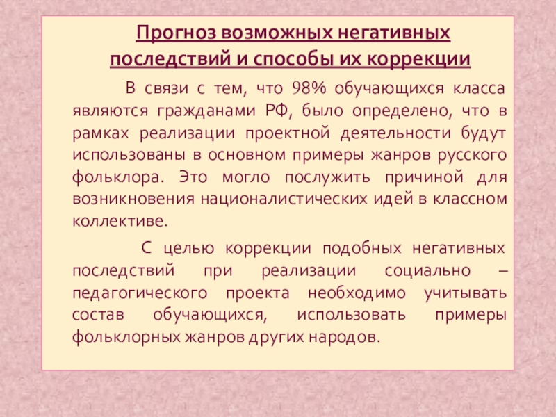 С целью коррекции подобных негативных последствий при реализации социально – педагогического проекта необходимо учитывать состав обучающихся, использовать примеры фольклорных жанров других народов.