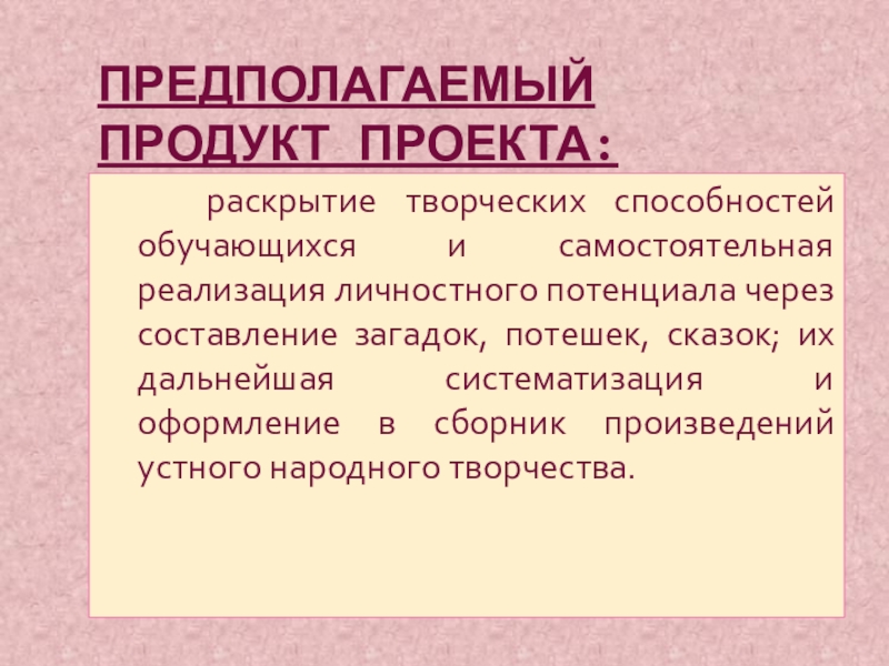 личностного потенциала через составление загадок, потешек, сказок; их дальнейшая систематизация и оформление в сборник произведений устного народного творчества.