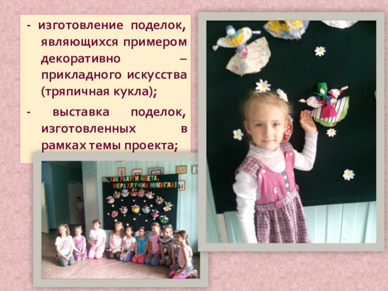 Слайд 13- изготовление поделок, являющихся примером декоративно – прикладного искусства (тряпичная кукла);