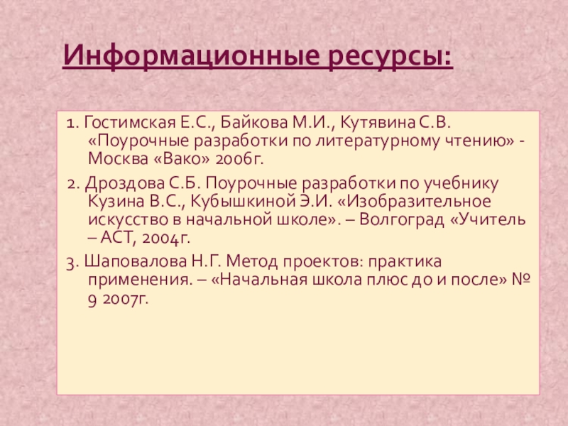 3. Шаповалова Н.Г. Метод проектов: практика применения. – «Начальная школа плюс до и после» № 9 2007г.