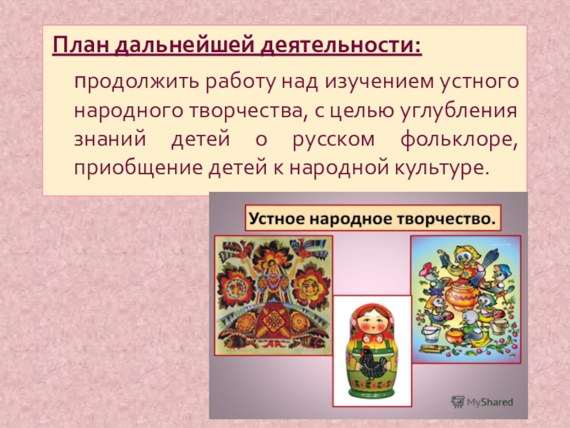 с целью углубления знаний детей о русском фольклоре, приобщение детей к народной культуре.