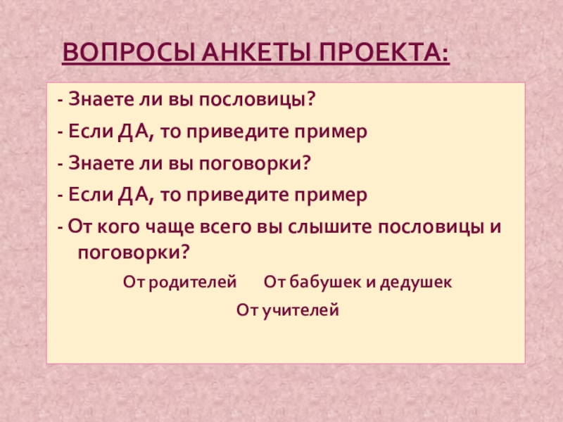 Слайд 9ВОПРОСЫ АНКЕТЫ ПРОЕКТА: