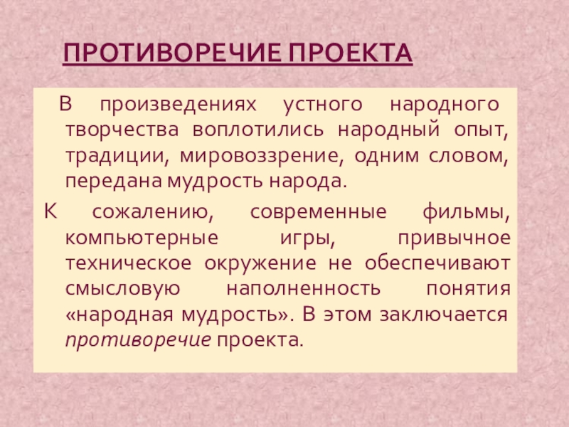 К сожалению, современные фильмы, компьютерные игры, привычное техническое окружение не обеспечивают смысловую наполненность понятия «народная мудрость». В этом заключается противоречие проекта.