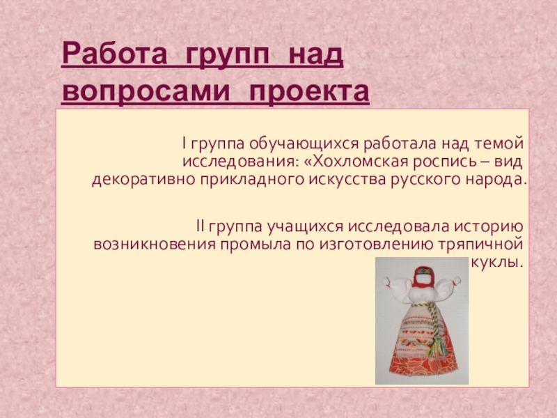II группа учащихся исследовала историю возникновения промыла по изготовлению тряпичной куклы.