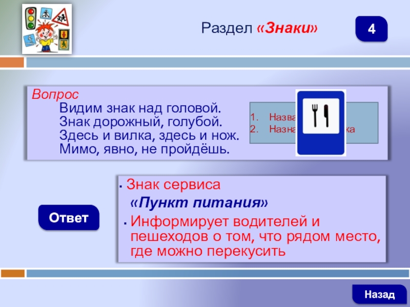 Информирует водителей и пешеходов о том, что рядом место, где можно перекусить