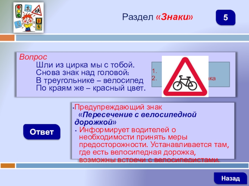 Информирует водителей о необходимости принять меры предосторожности. Устанавливается там, где есть велосипедная дорожка, возможны встречи с велосипедистами.