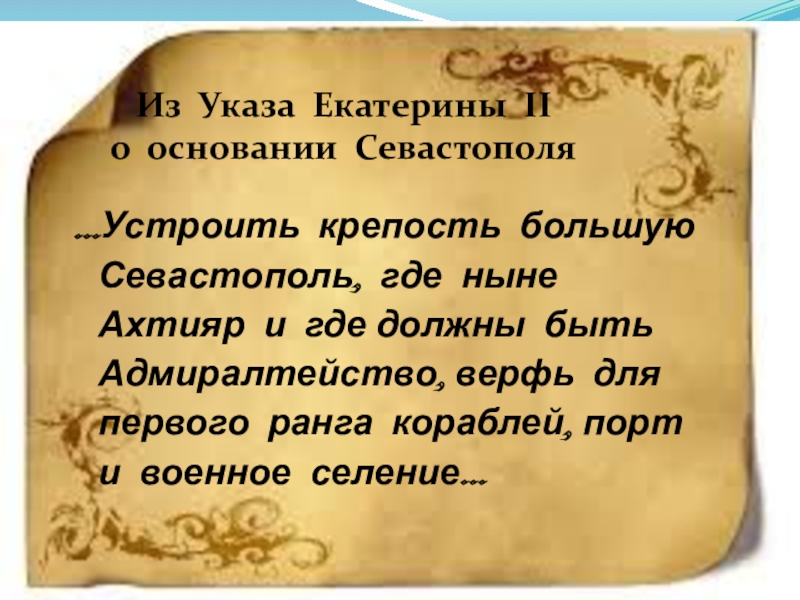 Из Указа Екатерины II  о основании Севастополя...Устроить крепость большую Севастополь, где ныне Ахтияр и где должны