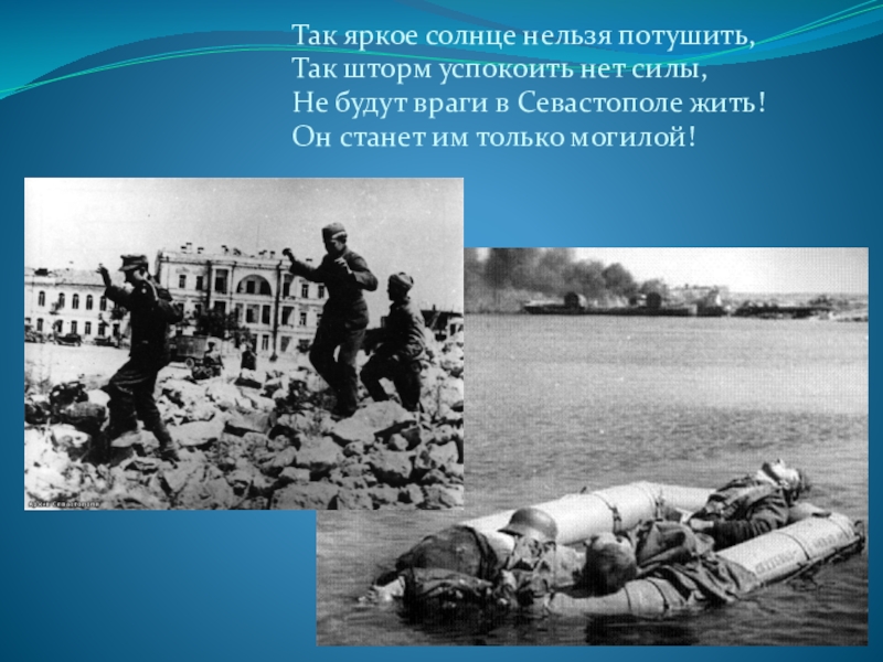 Так яркое солнце нельзя потушить,Так шторм успокоить нет силы,Не будут враги в Севастополе жить!Он станет им только