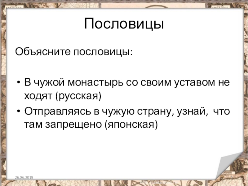 ПословицыОбъясните пословицы:В чужой монастырь со своим уставом не ходят (русская)Отправляясь в чужую страну, узнай, что там запрещено