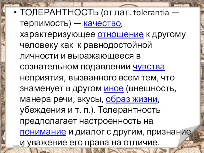 Слайд 4ТОЛЕРАНТНОСТЬ (от лат. tolerantia — терпимость) — качество, характеризующее отношение к