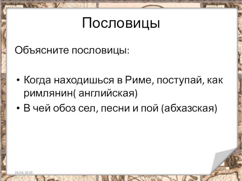 ПословицыОбъясните пословицы:Когда находишься в Риме, поступай, как римлянин( английская)В чей обоз сел, песни и пой (абхазская)