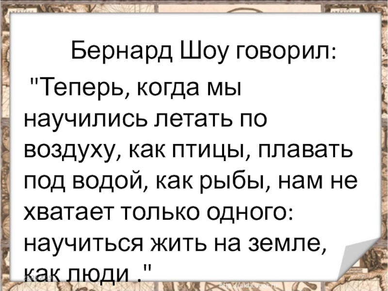 летать по воздуху, как птицы, плавать под водой, как рыбы, нам не хватает только одного: научиться жить на земле, как люди ."