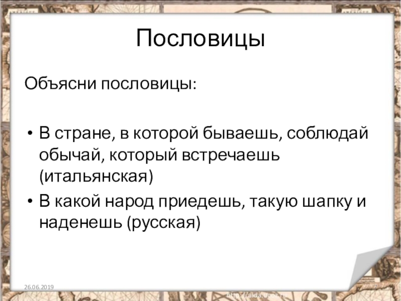 ПословицыОбъясни пословицы:В стране, в которой бываешь, соблюдай обычай, который встречаешь (итальянская)В какой народ приедешь, такую шапку и