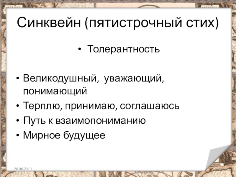 Синквейн (пятистрочный стих) Толерантность      Великодушный, уважающий, понимающий Терплю, принимаю, соглашаюсьПуть к взаимопониманиюМирное