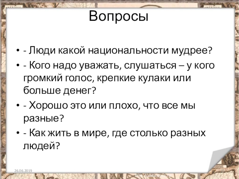 Вопросы- Люди какой национальности мудрее?- Кого надо уважать, слушаться – у кого громкий голос, крепкие кулаки или