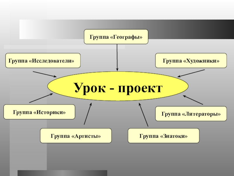 Урок - проектГруппа «Географы»Группа «Исследователи»Группа «Художники»Группа «Историки»Группа «Литераторы»Группа «Артисты»Группа «Знатоки»