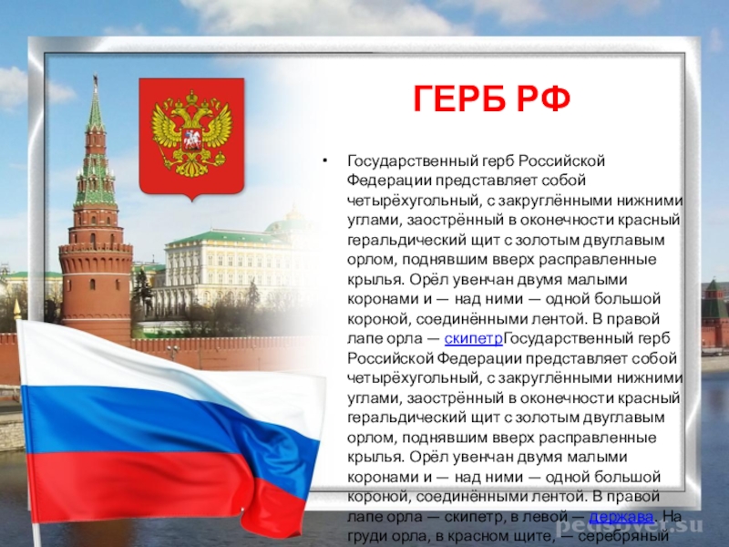 углами, заострённый в оконечности красный геральдический щит с золотым двуглавым орлом, поднявшим вверх расправленные крылья. Орёл увенчан двумя малыми коронами и — над ними — одной большой короной, соединёнными лентой. В правой лапе орла — скипетрГосударственный герб Российской Федерации представляет собой четырёхугольный, с закруглёнными нижними углами, заострённый в оконечности красный геральдический щит с золотым двуглавым орлом, поднявшим вверх расправленные крылья. Орёл увенчан двумя малыми коронами и — над ними — одной большой короной, соединёнными лентой. В правой лапе орла — скипетр, в левой — держава. На груди орла, в красном щите, — серебряный всадник в синем плаще на серебряном коне, поражающий серебряным копьём чёрного, опрокинутого навзничь и попранного конём дракона