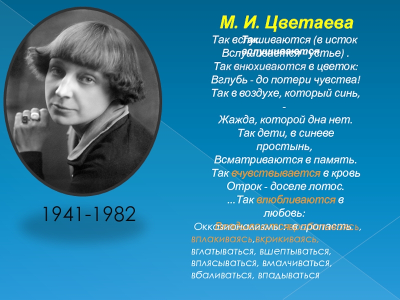 Окказионализмы : врабатываясь, вплакиваясь,вкрикиваясь, вглатываться, вшептываться, вплясываться, вмалчиваться, вбаливаться, впадываться