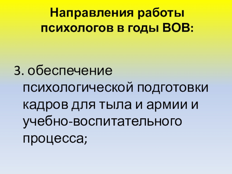 обеспечение психологической подготовки кадров для тыла и армии и учебно-воспитательного процесса;