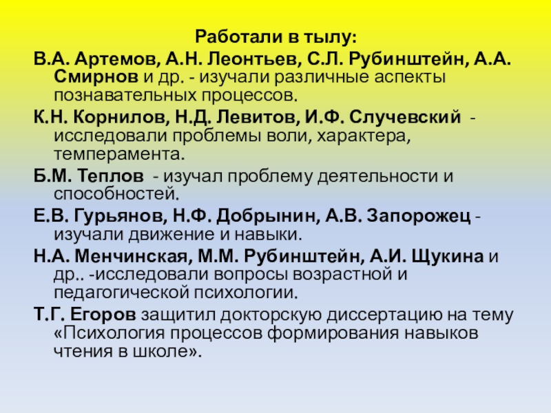 Абраменко, Г.М. Андреева, В.В. Богословский, А.И. Великороднова, А.В. Веденов, В.К. Гаврилов, А.И. Галактионов, М.В. Гамезо, А.Д. Глоточкин, М.Д. Громов, А.Я. Дудецкий, В.Я. Дымерский, М.И. Дьяченко, П.И. Зинченко, Ю.П. Зуев, Е.И. Игнатьев, В.И. Кауфман, В.И. Киреенко, Ю.И. Кириленко, С.М. Козловский, А.Г. Ковалев, В.И. Ковалев, В.Н. Колбановский, М.П. Коробейников, Н.И. Крылов, Е.С. Кузьмин, Ю.А. Кулагин, Н.Г. Левандовский, Г.Д. Луков, Н.Е. Малков, Н.С. Мансуров, Р.М. Мещерский, Е.А. Милерян, М.Ф. Морозов, М.М. Нудельман, В.В. Офицеров, А.М. Пашутин, А.В. Петровский, К.К. Платонов, Я.А. Пономарев, П.А. Просецкий, А.И. Раев, А.З. Редько, Т.А. Репина, М.С. Роговин, В.Ф. Рубахин, Ю.А. Самарин, И.Е. Синица, Е.Н. Соколов, А.В. Скрипченко, Б.С. Смирнов, А.А. Степанов, Л.М. Фридман, Б.И. Хотин, С.Н. Шабалин, Ф.Н. Шемякин, А.И. Щербаков, К.М. Шоломий, Д.Б. Эльконин, А.Р. Юсуп-заде, В.Н. Яцкевич и др.