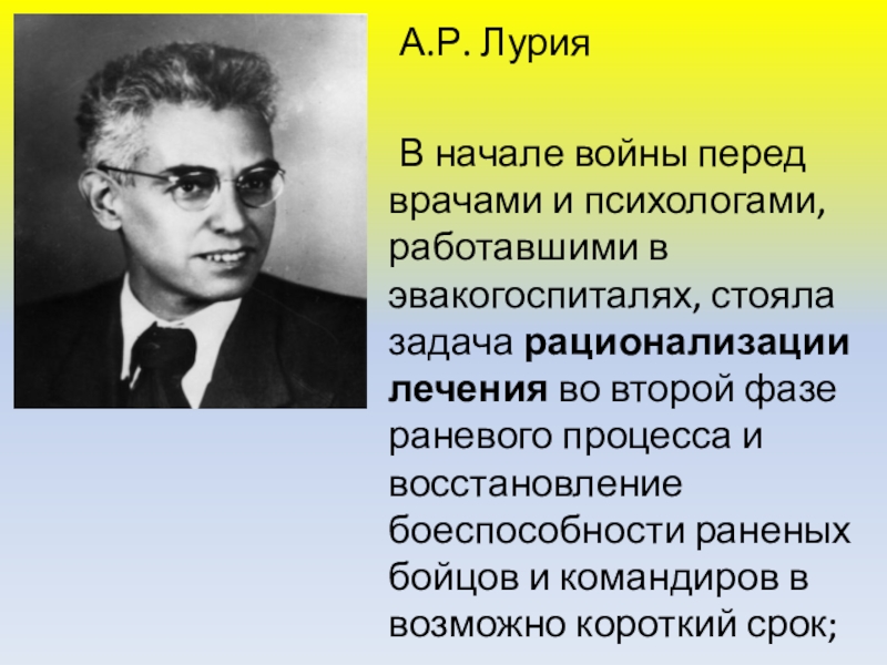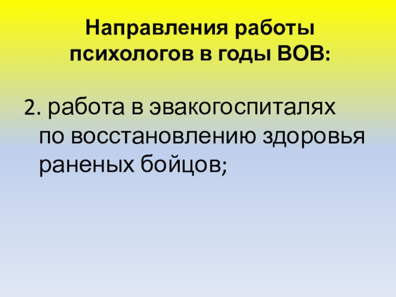 врачами и психологами, работавшими в эвакогоспиталях, стояла задача рационализации лечения во второй фазе раневого процесса и восстановление боеспособности раненых бойцов и командиров в возможно короткий срок;