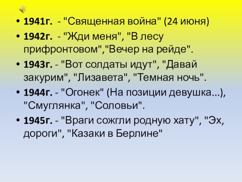 1944г. - "Огонек" (На позиции девушка...), "Смуглянка", "Соловьи".