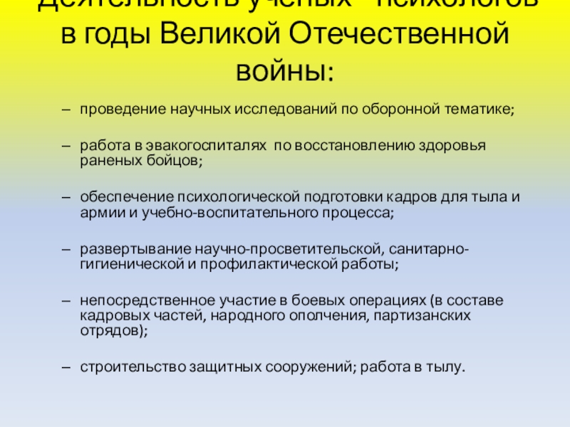 Слайд 26Деятельность ученых - психологов в годы Великой Отечественной войны: