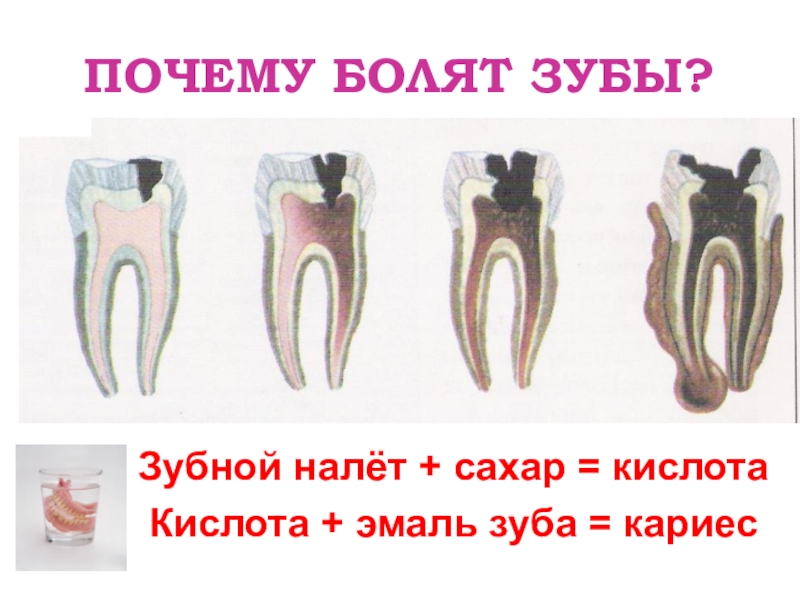 ПОЧЕМУ БОЛЯТ ЗУБЫ?Зубной налёт + сахар = кислотаКислота + эмаль зуба = кариес
