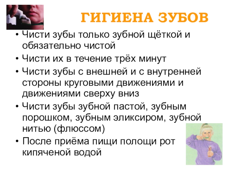 ГИГИЕНА ЗУБОВЧисти зубы только зубной щёткой и обязательно чистойЧисти их в течение трёх минутЧисти зубы с внешней
