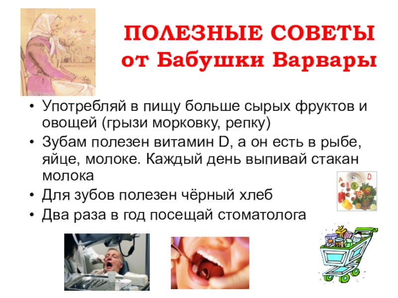 ПОЛЕЗНЫЕ СОВЕТЫ  от Бабушки ВарварыУпотребляй в пищу больше сырых фруктов и овощей (грызи морковку, репку)Зубам полезен