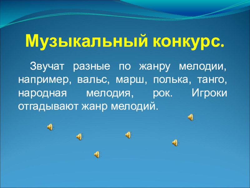 полька, танго, народная мелодия, рок. Игроки отгадывают жанр мелодий.