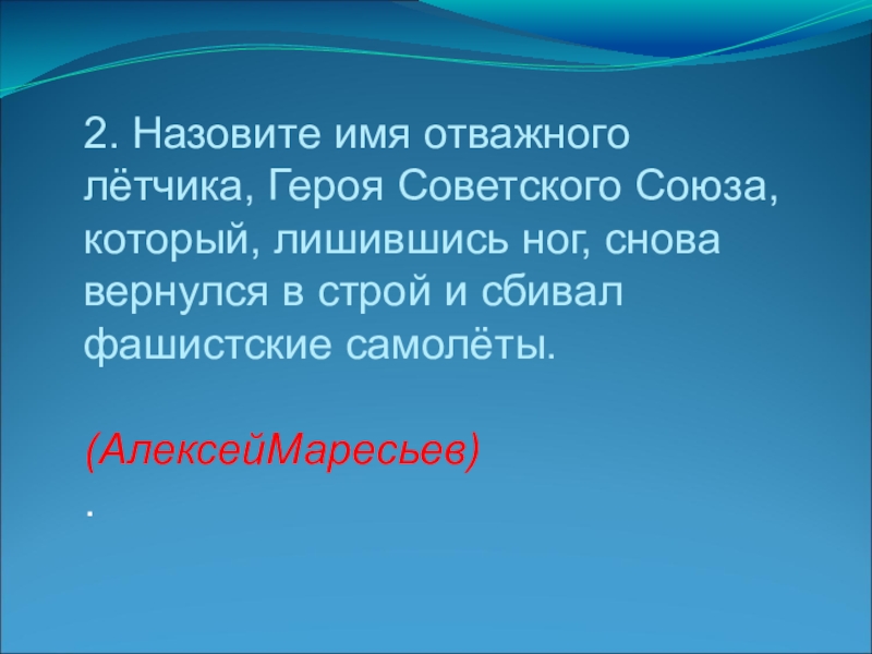 Слайд 232. Назовите имя отважного лётчика, Героя Советского Союза, который, лишившись ног,