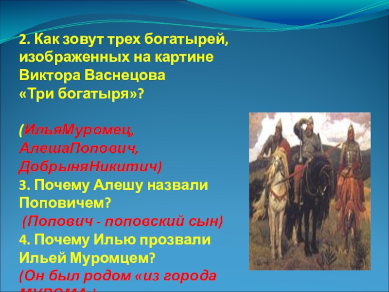 Слайд 32. Как зовут трех богатырей, изображенных на картине Виктора Васнецова