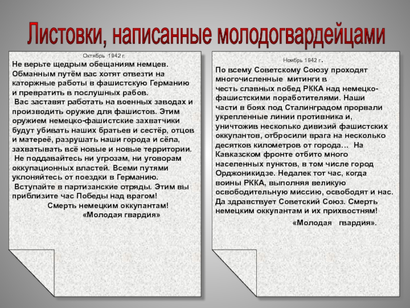 По всему Советскому Союзу проходят многочисленные митинги в честь славных побед РККА над немецко-фашистскими поработителями. Наши части в боях под Сталинградом прорвали укрепленные линии противника и, уничтожив несколько дивизий фашистских оккупантов, отбросили врага на несколько десятков километров от города… На Кавказском фронте отбито много населенных пунктов, в том числе город Орджоникидзе. Недалек тот час, когда воины РККА, выполняя великую освободительную миссию, освободят и нас. Да здравствует Советский Союз. Смерть немецким оккупантам и их прихвостням!