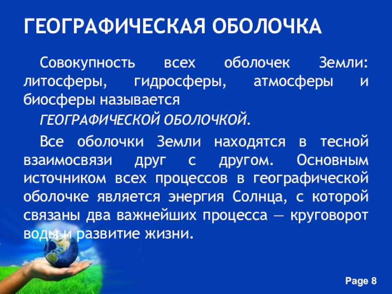 ГЕОГРАФИЧЕСКАЯ ОБОЛОЧКАСовокупность всех оболочек Земли: литосферы, гидросферы, атмосферы и биосферы называется ГЕОГРАФИЧЕСКОЙ ОБОЛОЧКОЙ.Все оболочки Земли находятся в