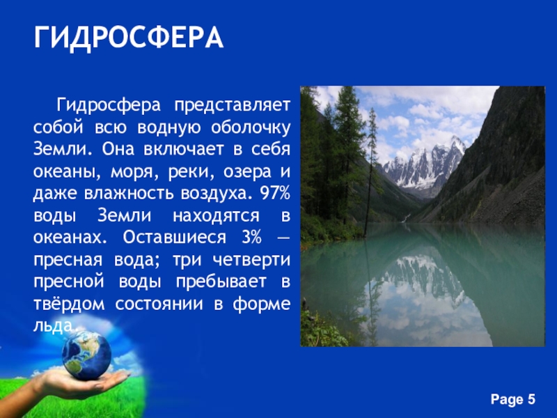 ГИДРОСФЕРАГидросфера представляет собой всю водную оболочку Земли. Она включает в себя океаны, моря, реки, озера и даже