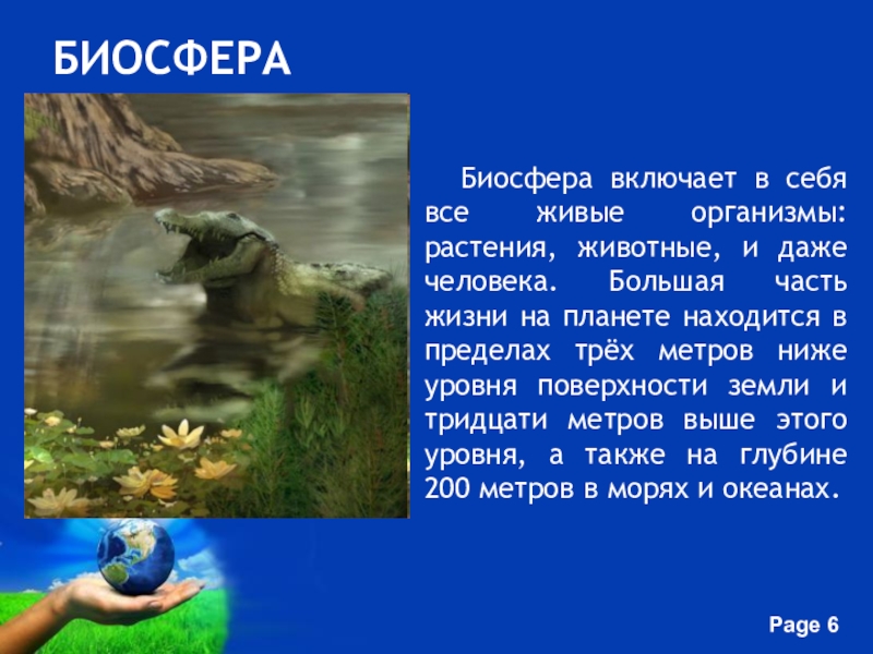человека. Большая часть жизни на планете находится в пределах трёх метров ниже уровня поверхности земли и тридцати метров выше этого уровня, а также на глубине 200 метров в морях и океанах.