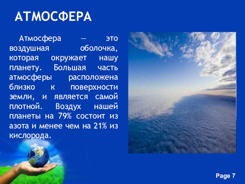 Атмосфера — это воздушная оболочка, которая окружает нашу планету. Большая часть