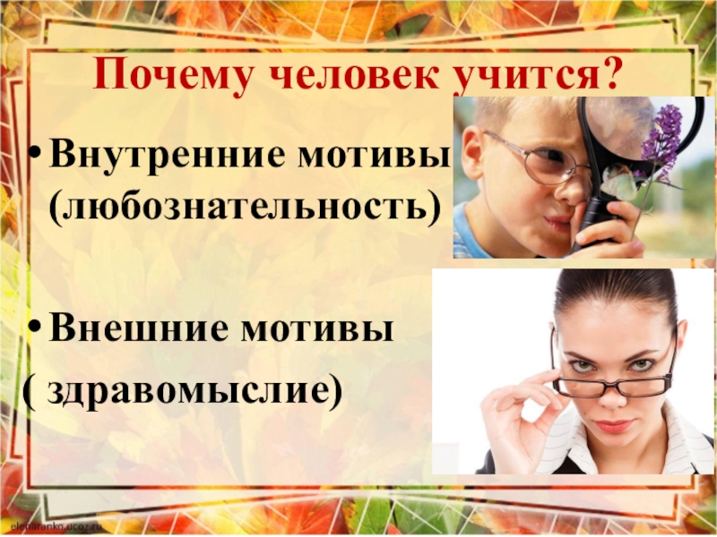 Почему человек учится?Внутренние мотивы (любознательность)Внешние мотивы ( здравомыслие)