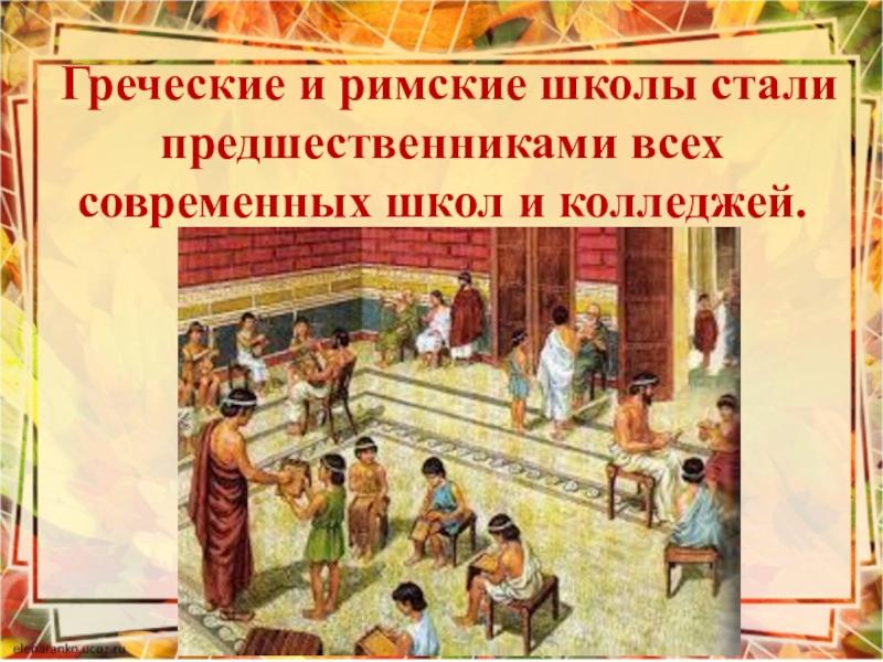 Слайд 8Греческие и римские школы стали предшественниками всех современных школ и колледжей.