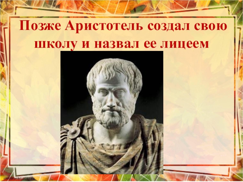 Слайд 10 Позже Аристотель создал свою школу и назвал ее лицеем