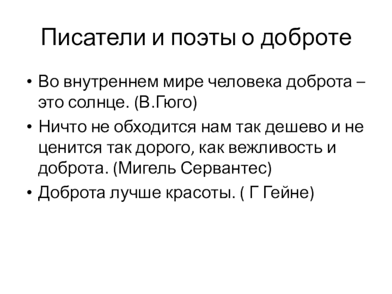 Писатели и поэты о добротеВо внутреннем мире человека доброта – это солнце. (В.Гюго)Ничто не обходится нам так