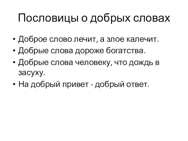 Пословицы о добрых словахДоброе слово лечит, а злое калечит.Добрые слова дороже богатства.Добрые слова человеку, что дождь в