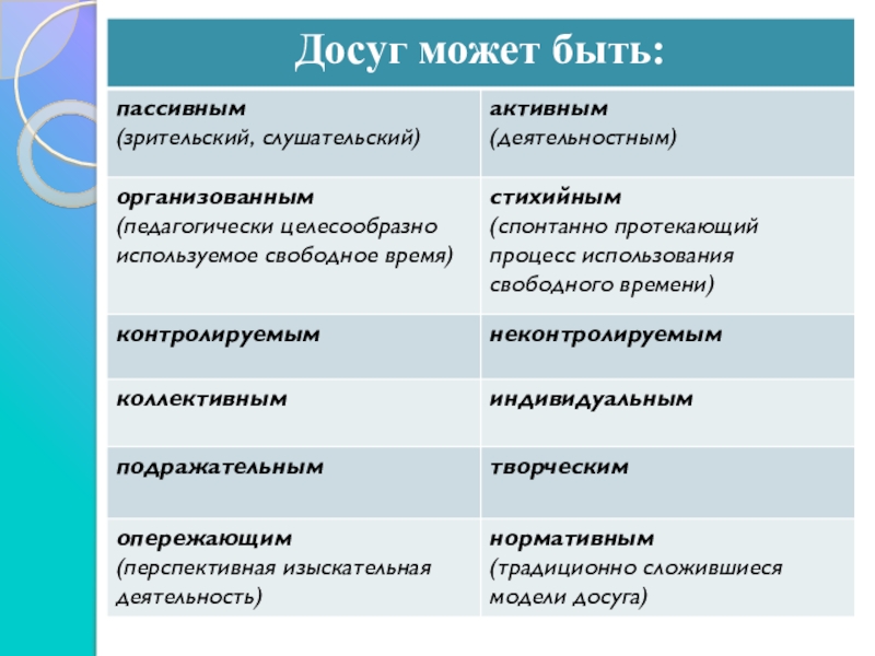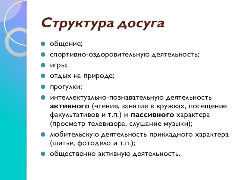 активного (чтение, занятие в кружках, посещение факультативов и т.п.) и пассивного характера (просмотр телевизора, слушание музыки);