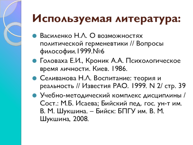 Учебно-методический комплекс дисциплины / Сост.: М.Б. Исаева; Бийский пед. гос. ун-т им. В. М. Шукшина. – Бийск: БПГУ им. В. М. Шукшина, 2008.