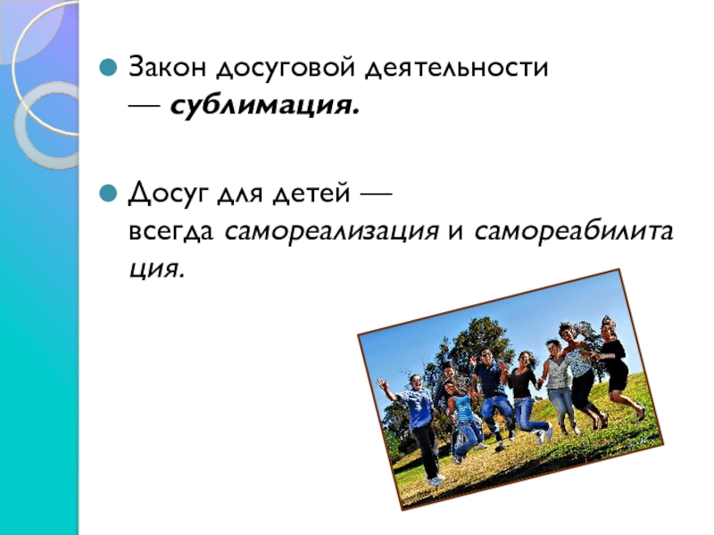 ► досуг есть то личное пространство, где наиболее полно и ярко раскрываются естественные потребности в свободе, независимости;