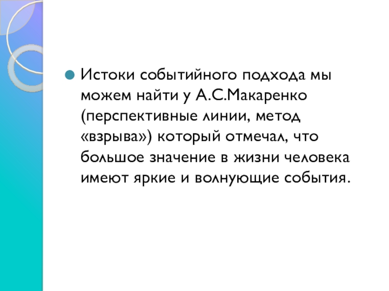 Слайд 17Истоки событийного подхода мы можем найти у А.С.Макаренко (перспективные линии, метод