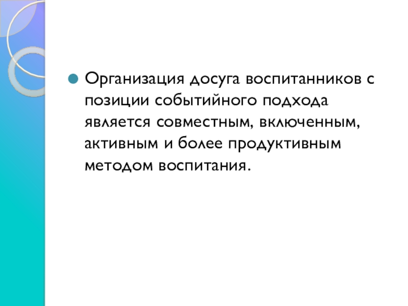 Слайд 21Организация досуга воспитанников с позиции событийного подхода является совместным, включенным, активным
