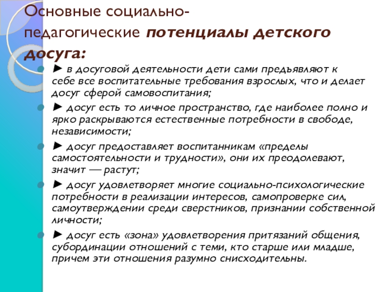 Слайд 10Основные социально-педагогические потенциалы детского досуга: