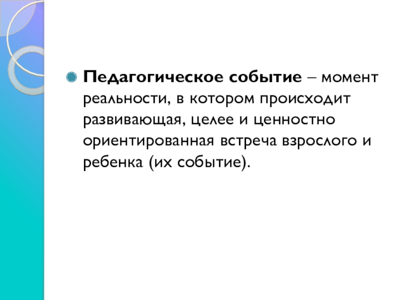 Слайд 19Педагогическое событие – момент реальности, в котором происходит развивающая, целее и